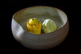De klei wordt de biscuit op 1000℃ gebakken en daarna geglazuurd op 1260℃ gebakken. Hierdoor komt de kleikleur maximaal tot leven en wordt de zeer dun gedraaide vorm minder kwetsbaar. Ieder stuk is uniek en is genummerd.